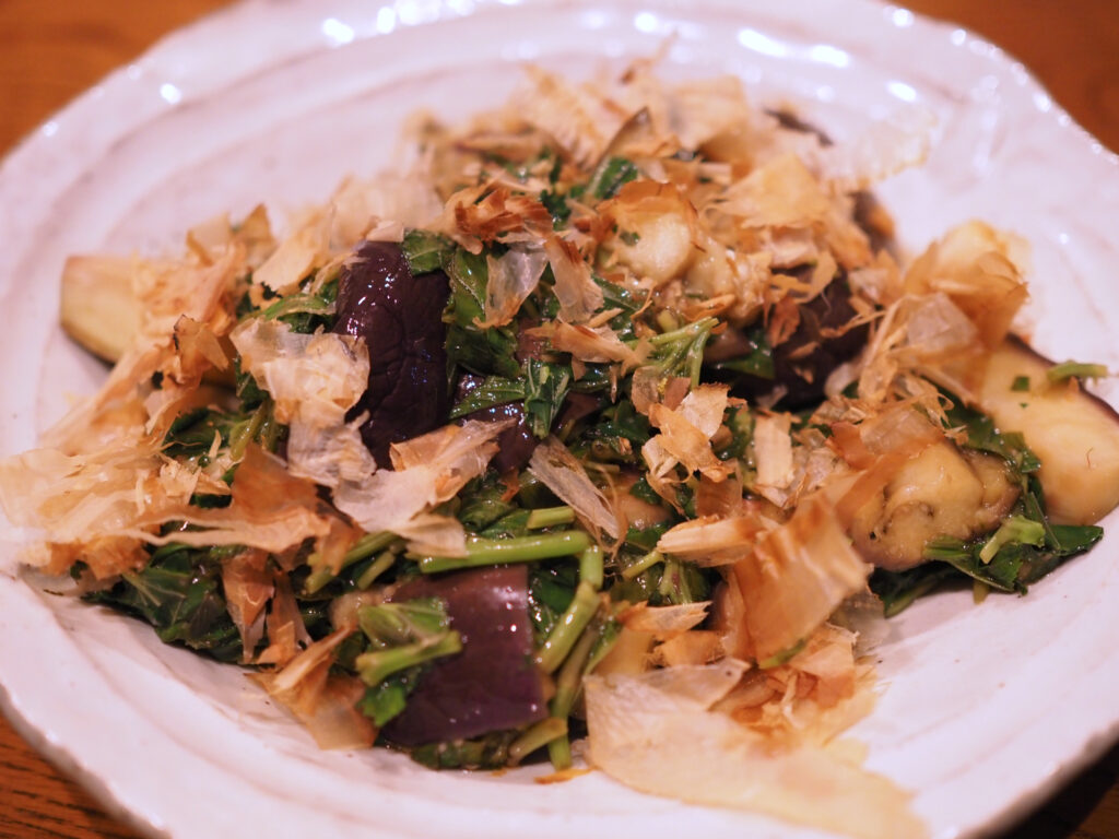 ▽材料(3〜4人分)•ナス 3本•モロヘイヤ 1袋•鰹節 適量•ポン酢 適量 ▽作り方①ナスは半分の長さに切り、縦4~6つに切る。モロヘイヤは茎と葉に分ける。②ナスは皮を下にしてフライパンにならべ、水50ccを加え、蓋をして強火で2分蒸し、火を止めて1分置い... -
