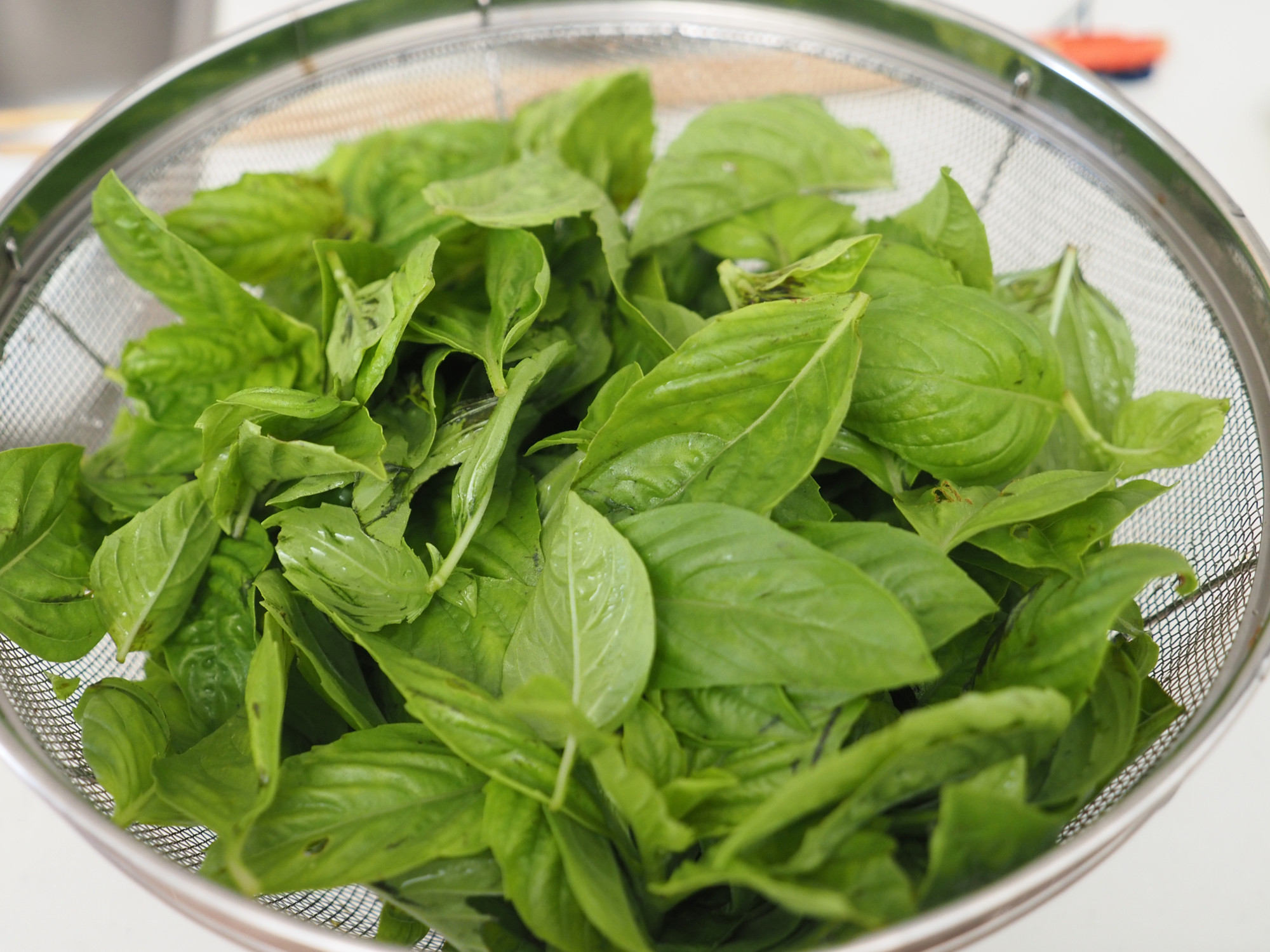 ①バジルは茎をのぞき、洗って水をよく切る。