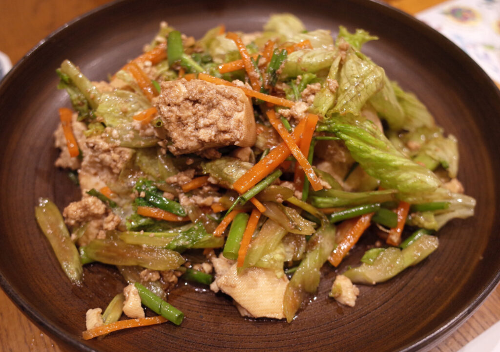 ①木綿豆腐は6等分にちぎり、ペーパータオルにのせて10分水気をきる。サニーレタスは食べやすくちぎり、ねぎは斜め薄切り、セロリとにんじんはせん切り。