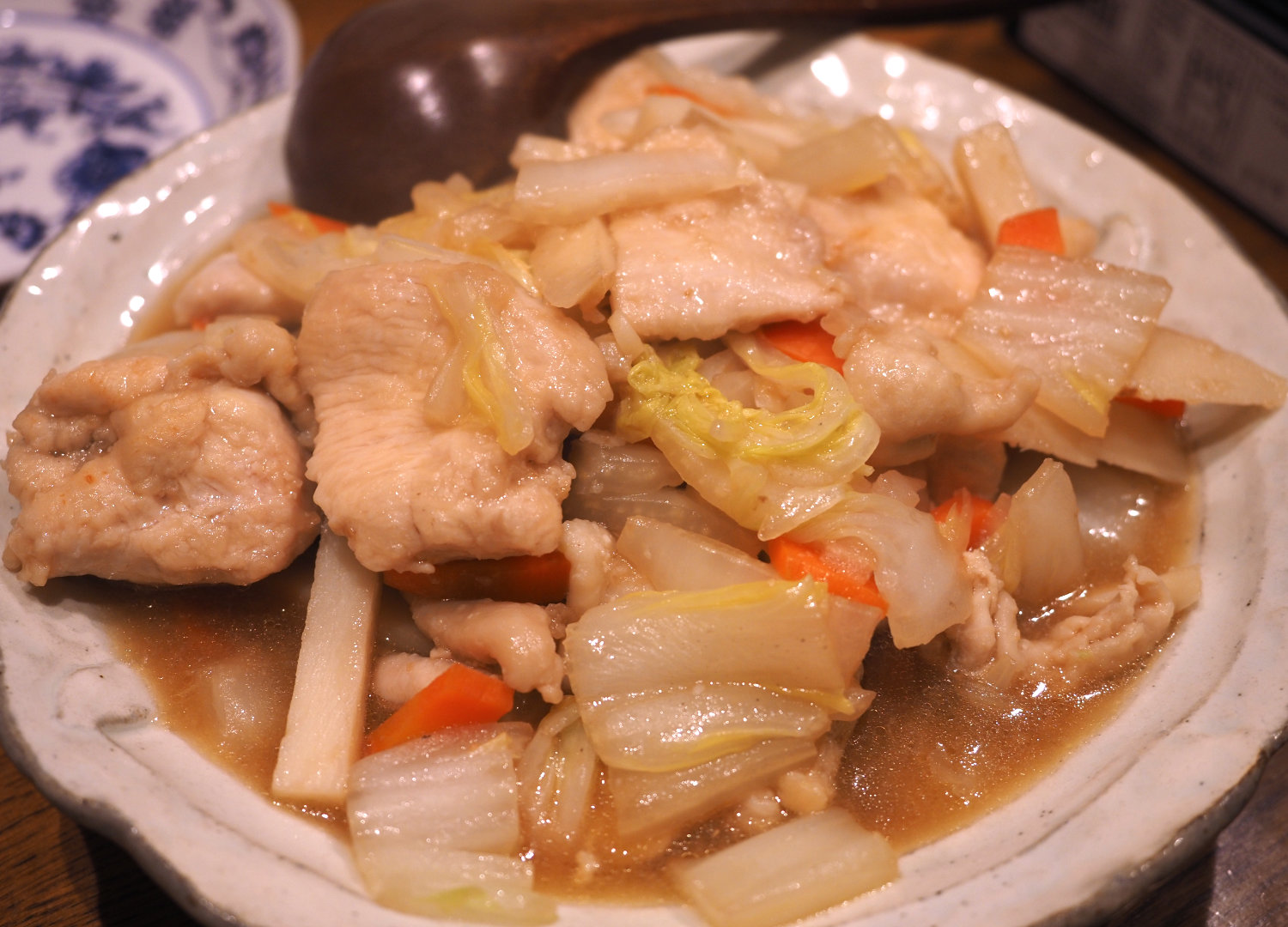 ③フライパンにごま油を熱し、白菜の芯、にんじんを入れ、油が全体にまわったら、白菜の葉を入れてさっと炒め、★を加える。