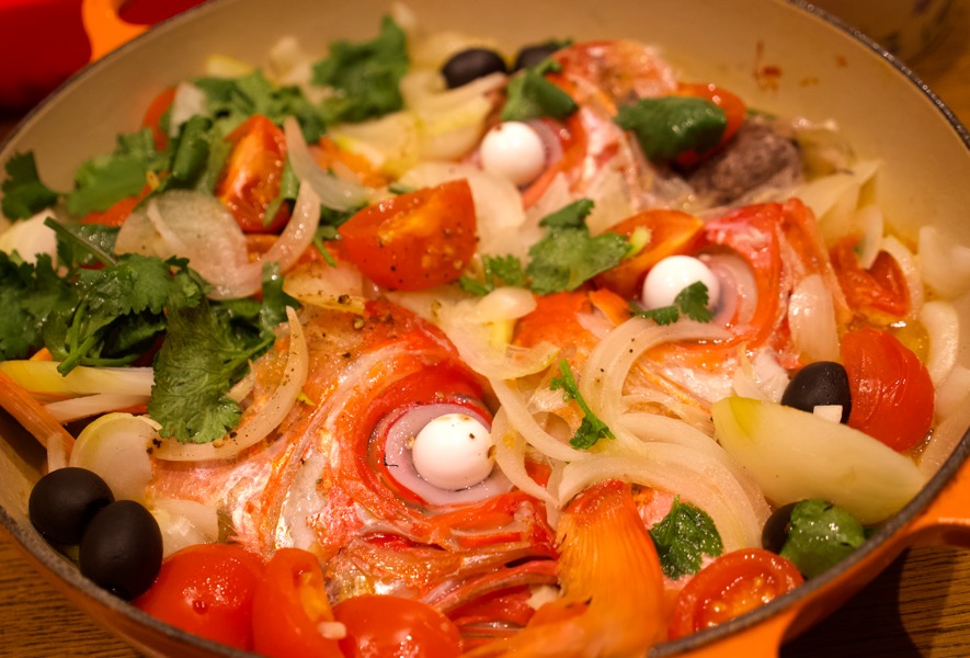 ⑤魚に火が通り、スープにとろみがついたら塩で味を調整。オリーブとパクチーを散らす。