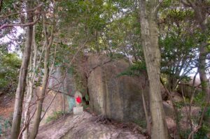 JR六地蔵駅から東の山にむかって歩くこと40分。山に近づくと、住宅街でもホタルがでるようだ。谷沿いをさかのぼり、車道がつきて杉林の山道を10分ほどのぼると、谷がちょっと広がり住みやすそうな空間があらわれるが、ここではない。さらに5分、急坂をのぼると、標高150メートルの森の斜面に巨大な磐座があらわれた。