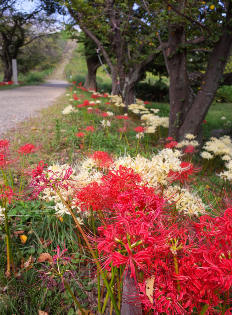 最小の前方後円墳である愛宕山古墳から、赤白の曼珠沙華(ヒガンバナ)が咲きみだれる小道をたどり、高さ17㍍、直径105メートルという日本最大の円墳・丸墓山古墳にのぼる。