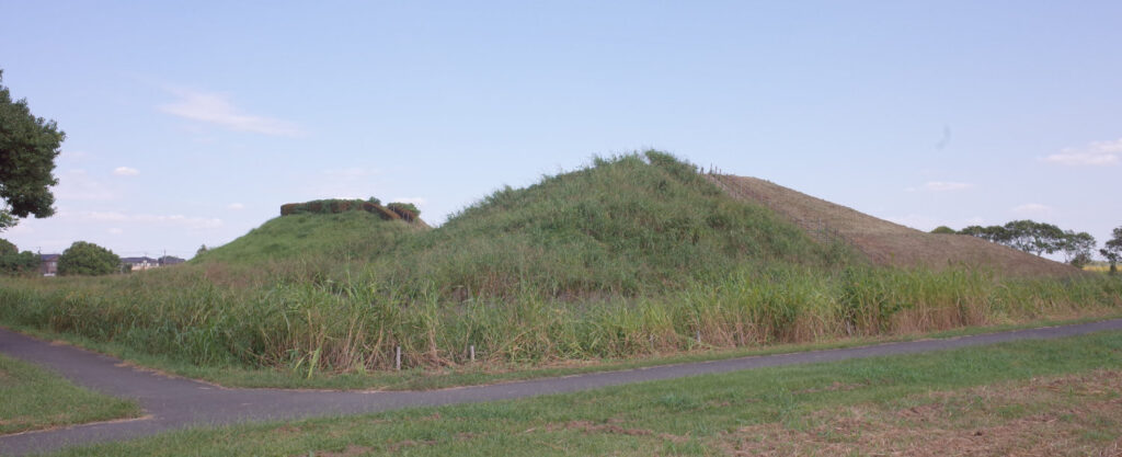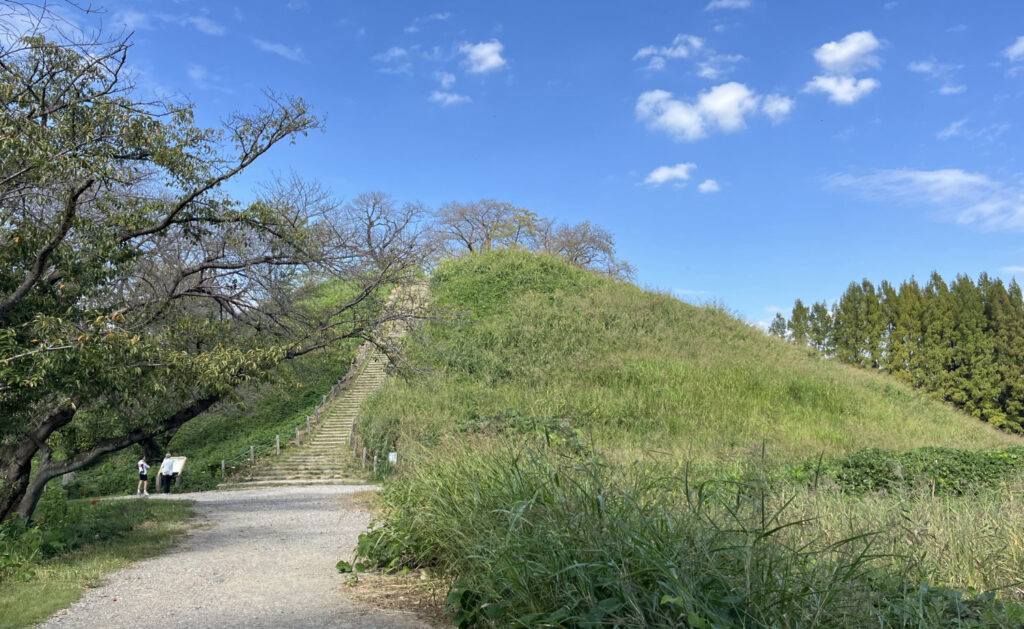 私の記憶ではだったが、目の前の草の古墳はまぎれもない前方後円墳だ。実は前方部は1937年に土取り工事で失われ、私がのぼった時は円墳になっていた。前方部は2004年に復元された。