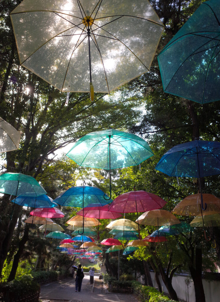 ケヤキの巨木がさわやかな境内を抜けて裏の小道をたどると水城公園。それを抜けるとSLのC57があり、さらに、ビニール傘をアーケードの天井のようにかざった小道がある。「アンブレラスカイ」というイベントらしい。梅雨時でも歩くのが楽しくなりそうだ。
