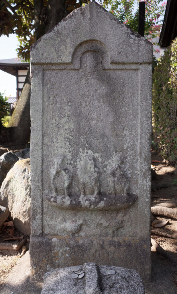 アゴを突き出したような像は青面金剛か不動明王と思われるが、足元の猿ははっきりわからない。でもその裏側に、3匹の猿を下部にあしらった碑がある。こちらは寛永年間の庚申塔らしい。庚申塔や道祖神にはなぜか心がひかれる。