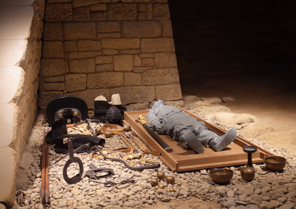 後円部の頂上から鉄剣は出土した。471年に制作され、全長73.5センチの剣の表面に「ワカタケル大王(雄略天皇)」の名など115の金文字がきざまれていたことで「100年に1度の発見」と大騒ぎになった。