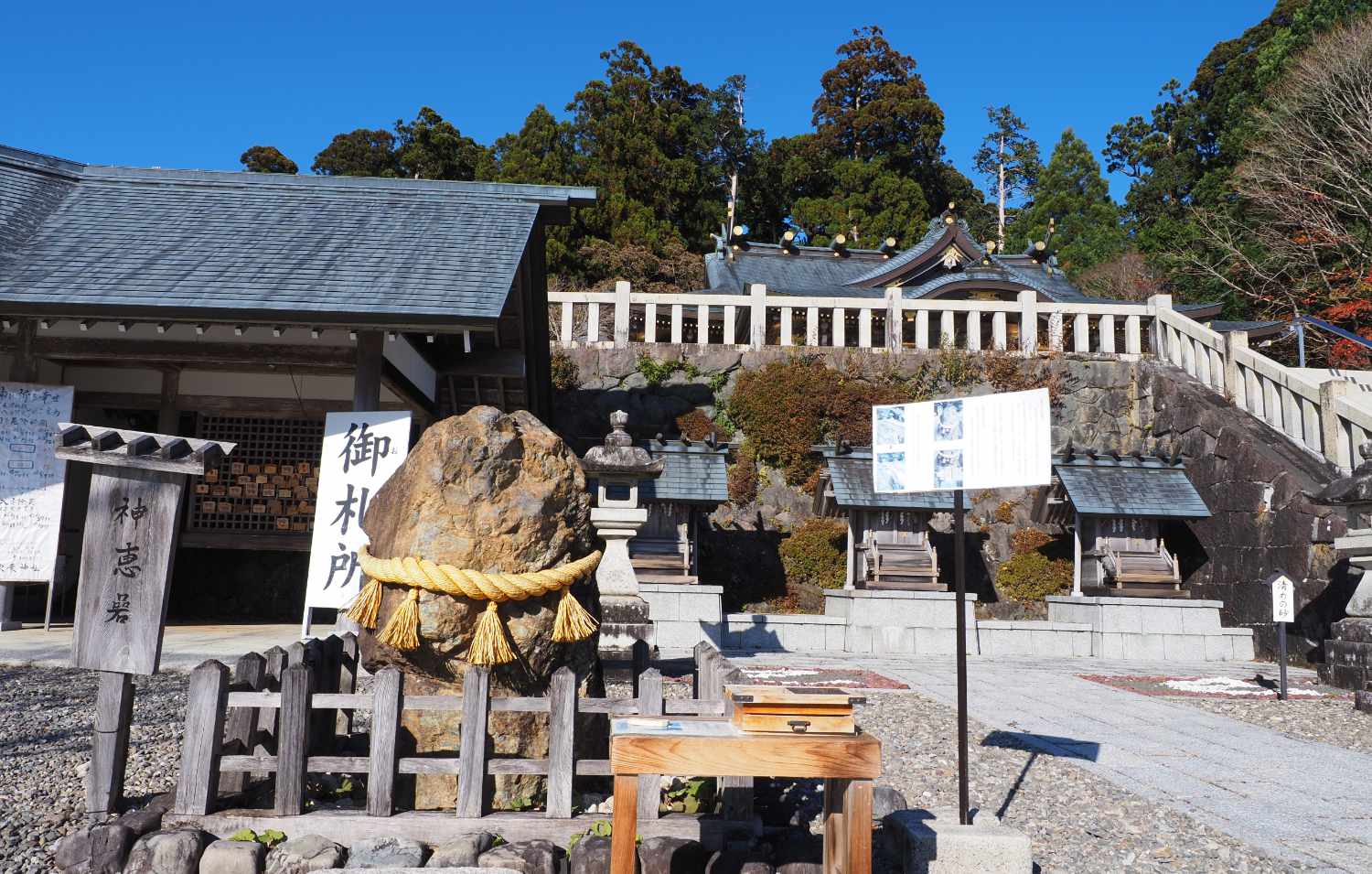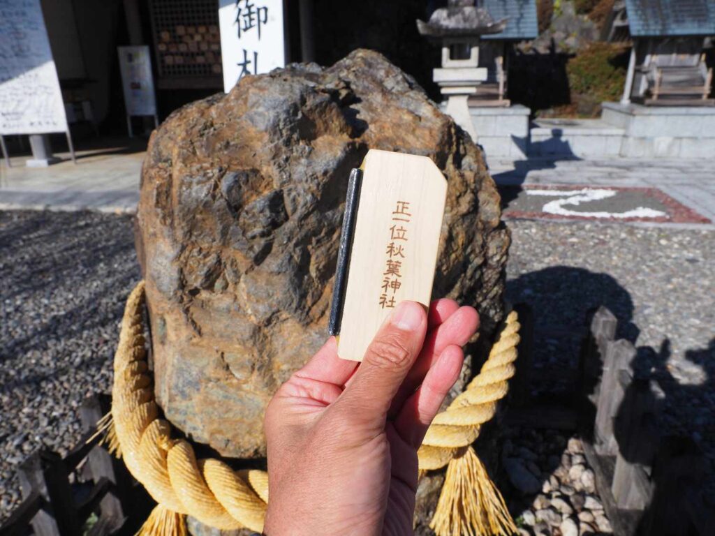 食堂を兼ねる社務所の上の頂上に本殿がある。その前に注連縄がまかれた「神恵岩」が鎮座している。そなえつけの火打ち金で岩をたたくと線香花火のような火花が散った。
