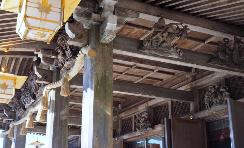 本殿の軒下には干支の彫刻がきざまれている。毎年、干支にあわせて彫刻の位置をかえるらしい。