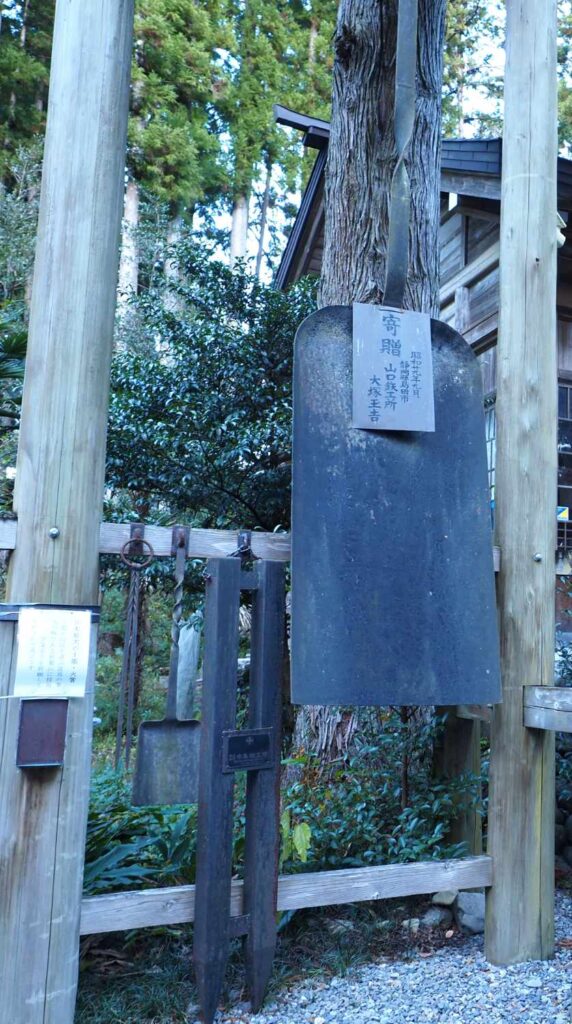 気田川沿いの山際の集落に、下社は鎮座している。杉の木立の石段をのぼると、広々とした境内に本殿がたち、日本最大という十能と火箸がかざられている。火の神である秋葉山に技術向上を祈願して奉納されたという。火はたたら製鉄にもつながるから「技術」の神でもあったのだろう。