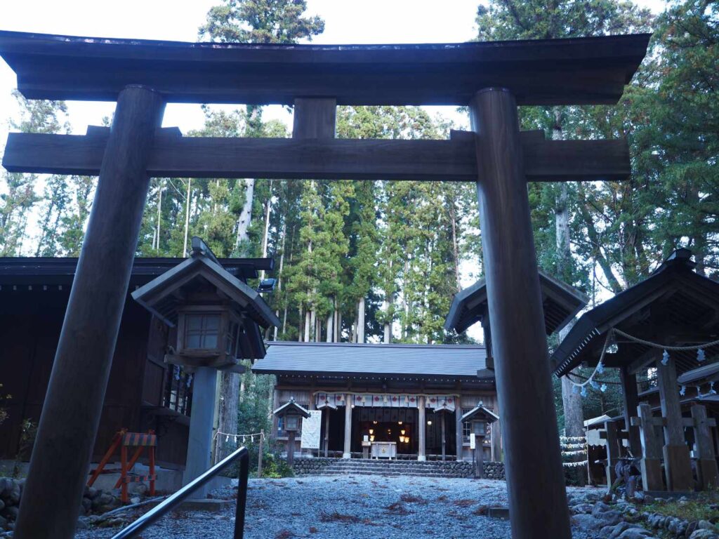 わきの小さなお堂の案内板に歴史がしるされている。昭和18(1943)年3月13日、ふもとの鉱山からおきた山火事で神社の建物はことごとく焼けた。上社本殿が1986年に再建されるまでは、すべての神事は下社本殿でおこなわれていた。上社から少し下った表参道の神門だけが唯一の江戸時代の建造物という。