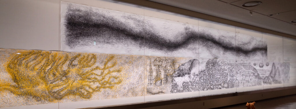 「営みの祈り」という畳数枚分もある横長の作品は、右には生業(営み)として田畑をたがやす人びとがえがかれ、左には津波と火災、原発が爆発する場面だけ色をつけている。