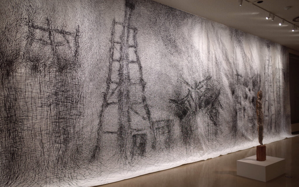 「福島原発爆発ドローイング」は原発の廃墟の無機質な不気味さを黒い線だけで表現する。