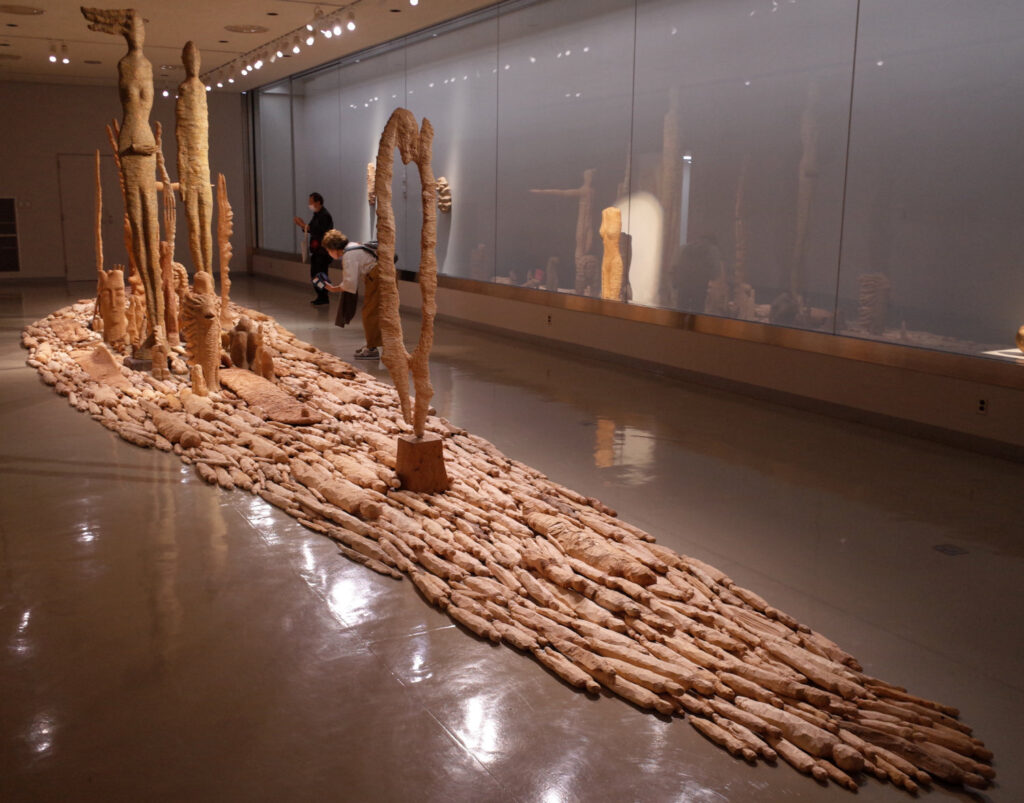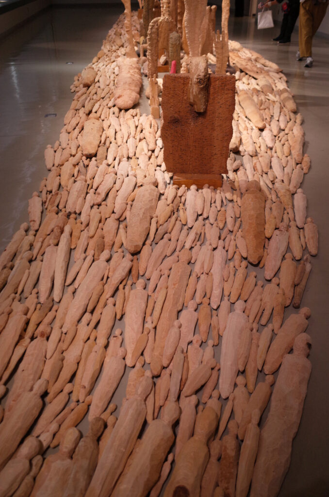 一番の大作は「約束の船」。円空仏のような人型の木像が地面に無数に横たわって船を形づくり、その上に、神仏や人間、動物、異形の生物がたちあがっている。