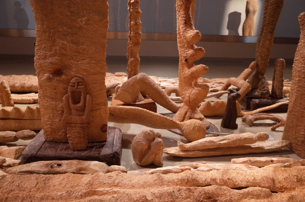 ヒノキから彫りだした「3.11 光りのさなぎたち」、トーテムポールのような「宇宙の果実の梯子」、狛犬の木像……。